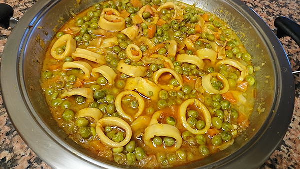 Deixem fer el sofregit i ja hi podrem posar els calamars tallats a rodanxes i els pèsols si són frescos, si fem servir pèsols congelats els podeu posar més tard. En aquest moment, abaixem el foc i ho deixem coure amb la cassola tapada.